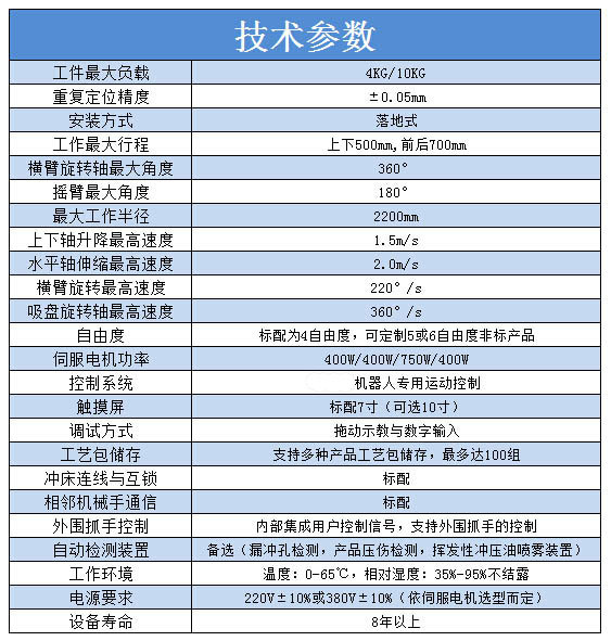 2、全面滿足沖床自動上下料需求:可根據沖床高度、送料高度、下料高度自 動適應,伸縮軸可根據實際需要自由伸展,旋轉軸可進行自由角度的旋轉;